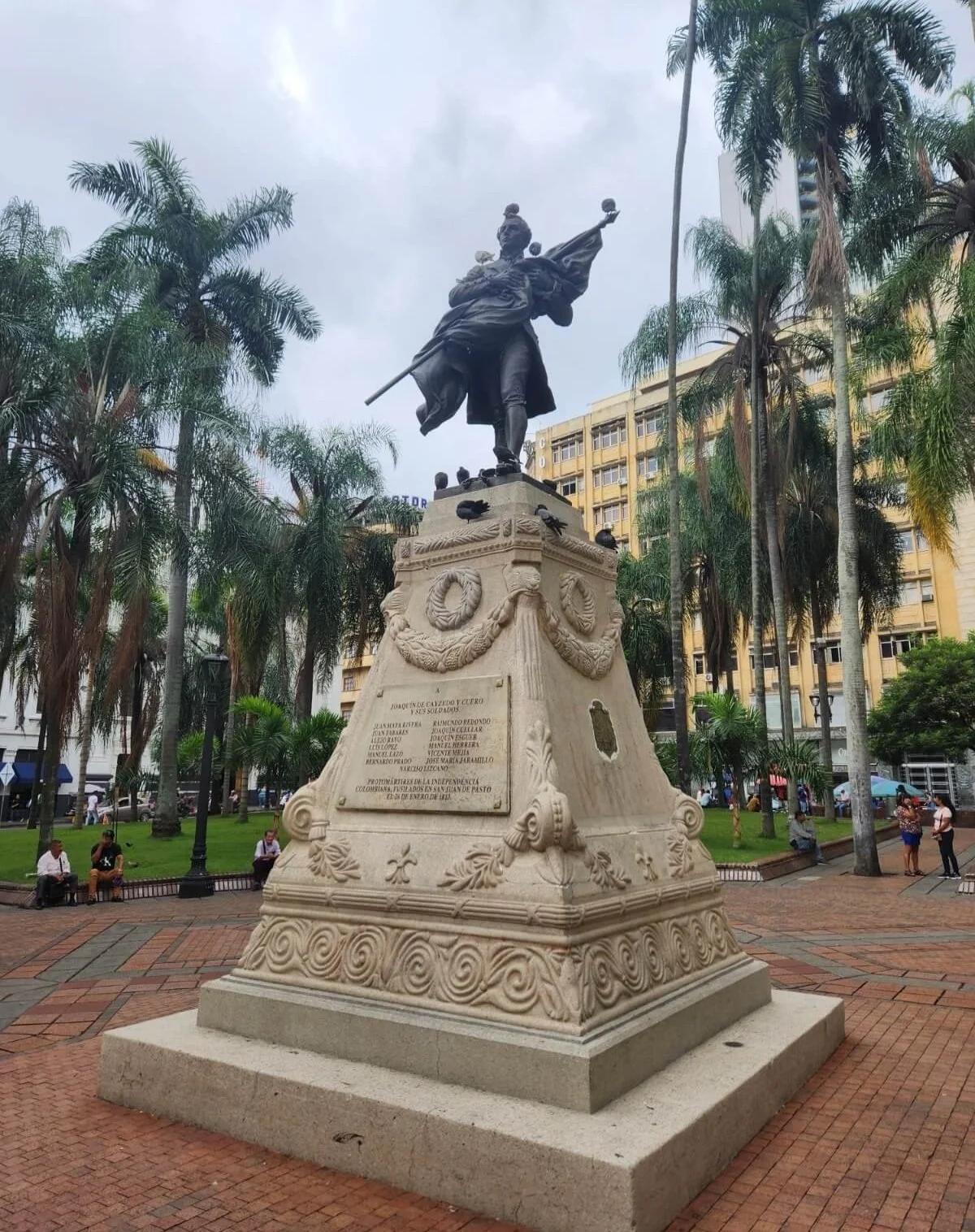Starte am Plaza Caicedo, dem von wunderschönen Palmen gesäumten Hauptplatz Calis. Der Platz ist benannt nach dem Politiker und Unabhängigkeitskämpfer Joaquín de Cayzedo, der im frühen 19. Jahrhundert für die Unabhängigkeit Calis (und Kolumbiens) von der spanischen Krone kämpfte und dafür im Süden Kolumbiens, in Pasto, hingerichtet wurde. Von ihm findest du eine Statue in der Mitte des Platzes.